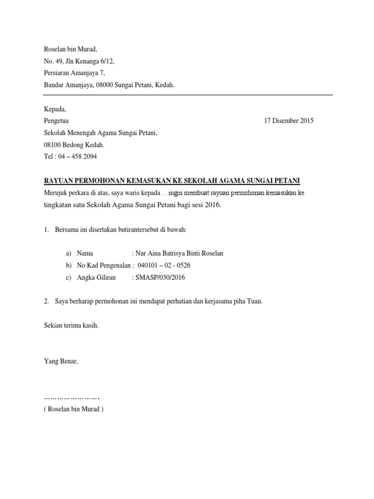 Contoh Surat Rayuan Ke Sekolah Agama Terengganu Z